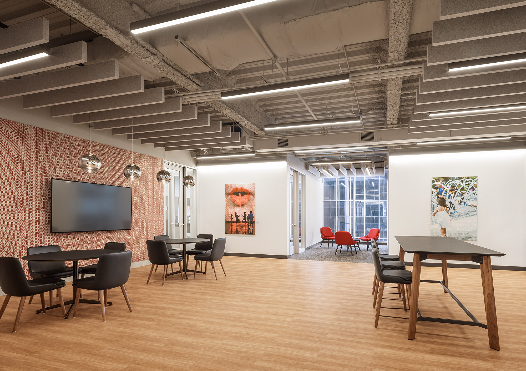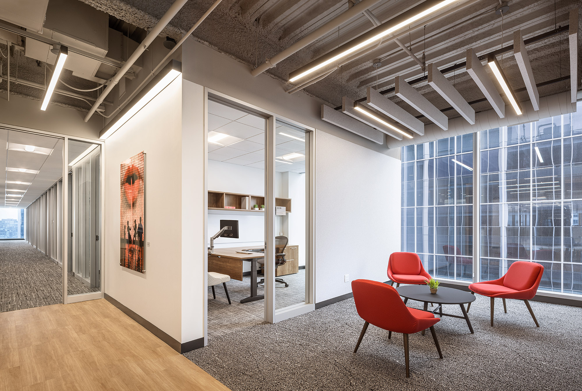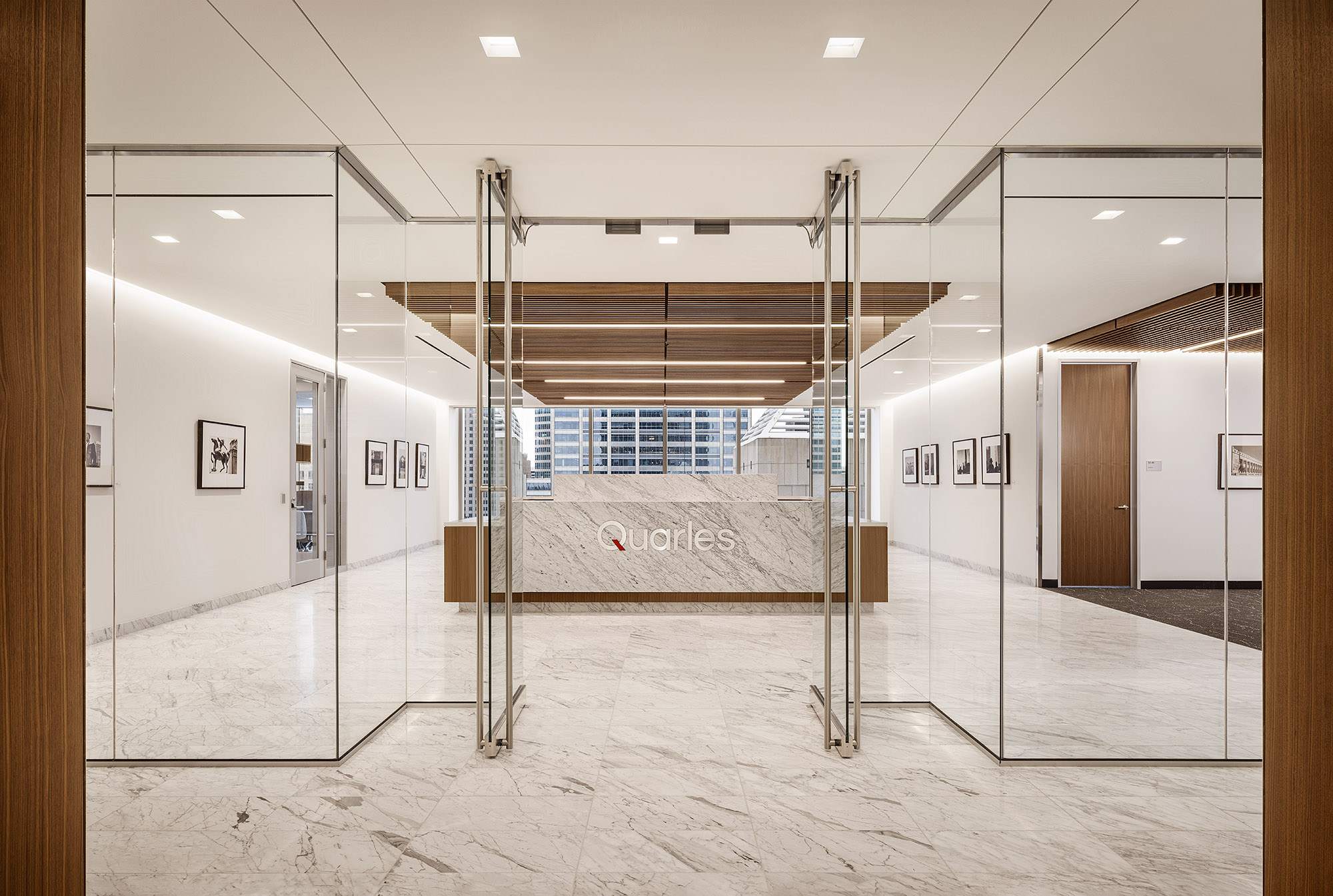 Working closely with Stantec, the design team, Forward Space helped bring Quarles’ vision to life with a balance of quiet luxury and functional spaces. Beyond high-end furnishings, key design features include wide hallways, breathtaking views through full-height windows, and acoustic wall coverings in communal areas like the café. The office also integrates local flair with stunning artwork featuring photographs of Chicago landmarks, adding a distinct regional charm to the professional atmosphere.