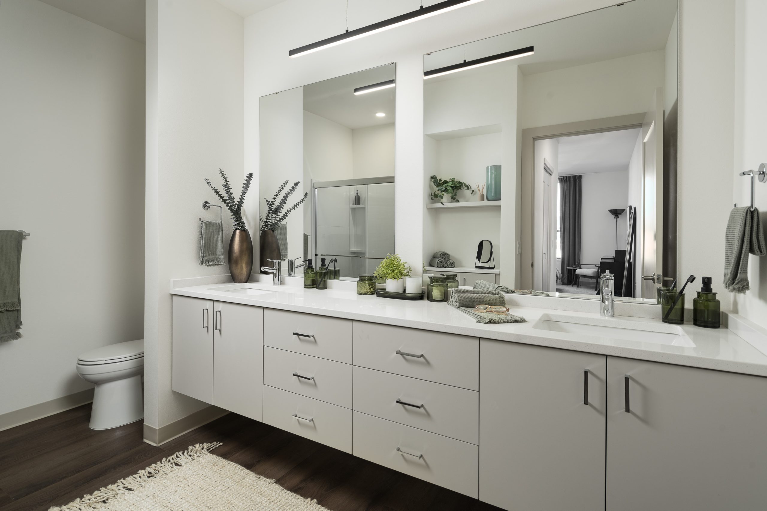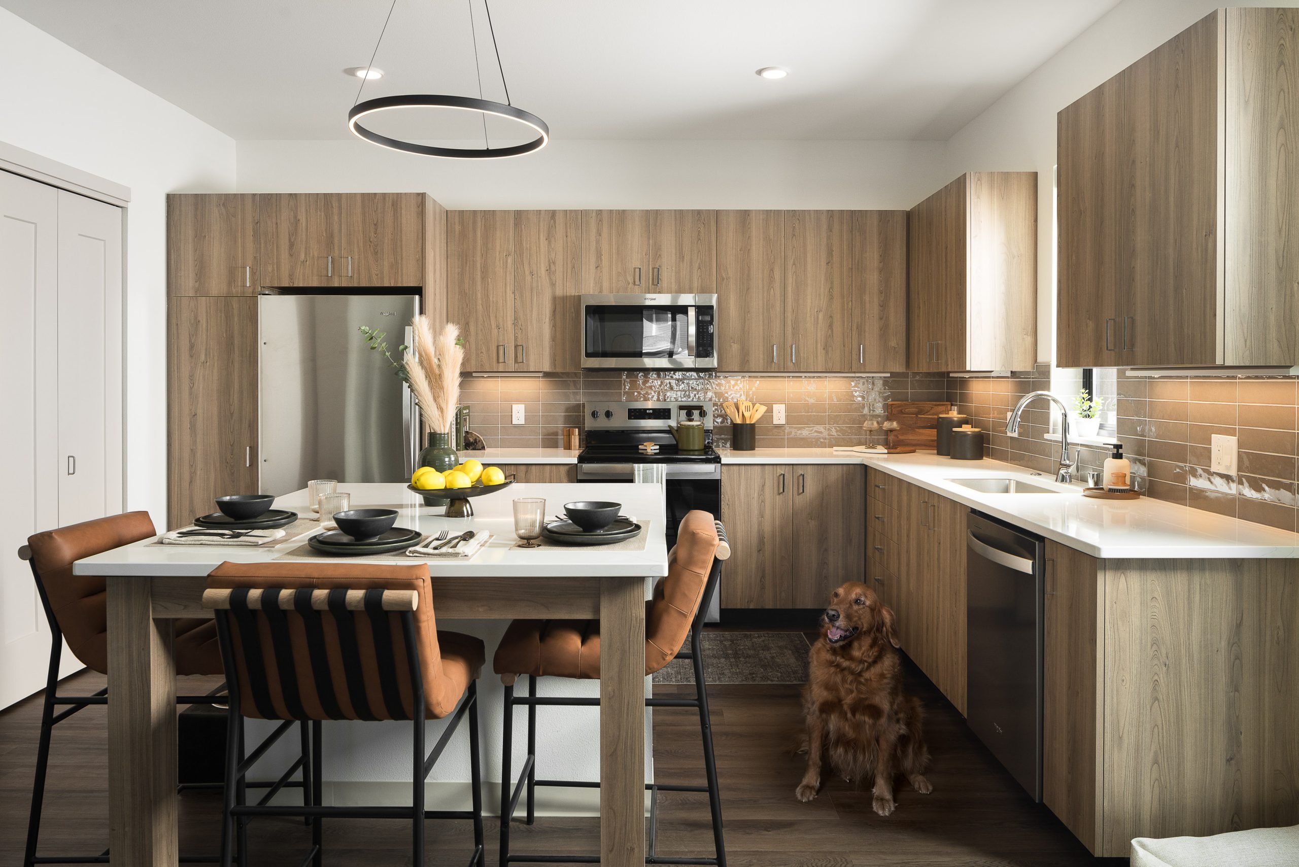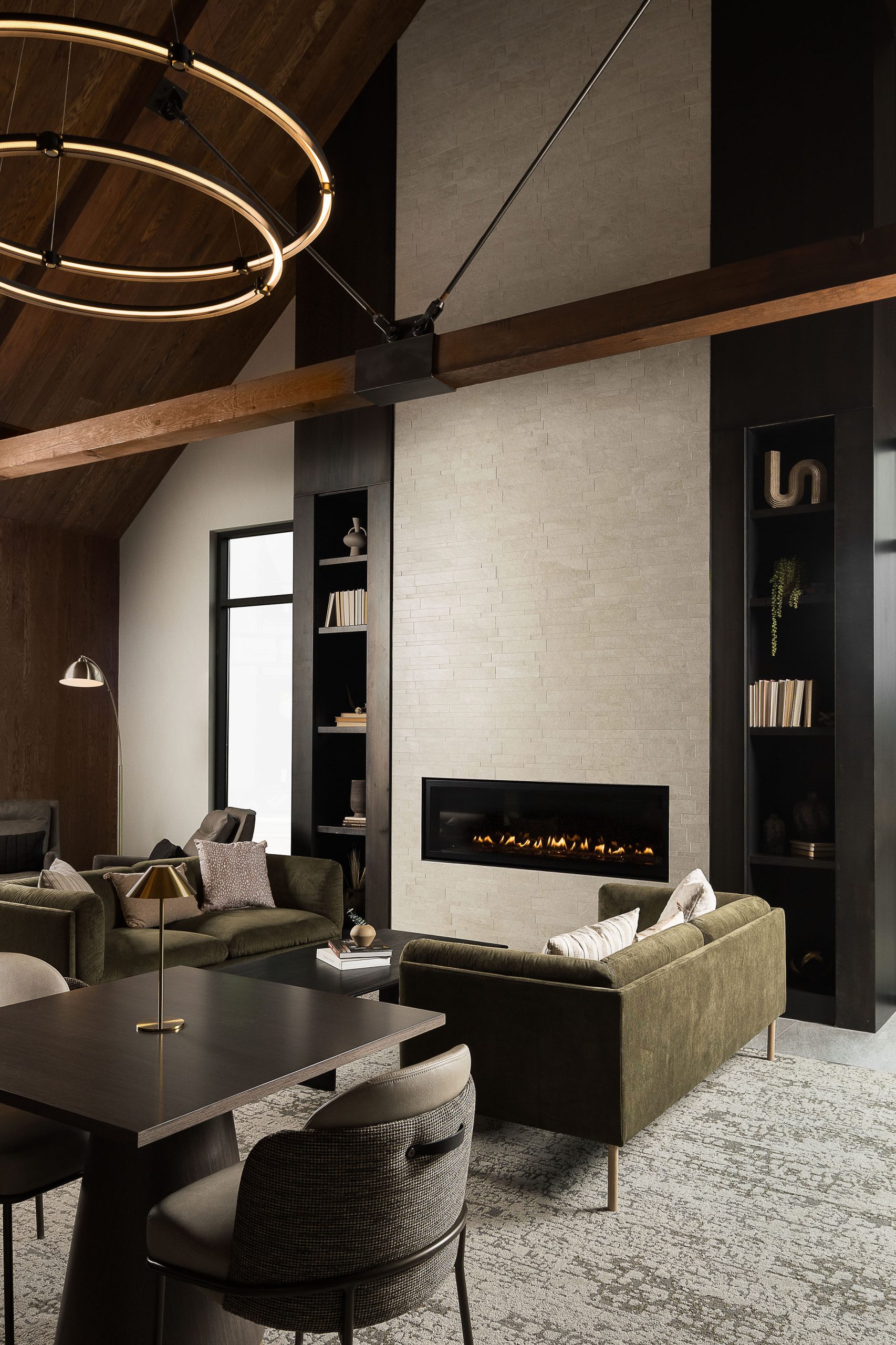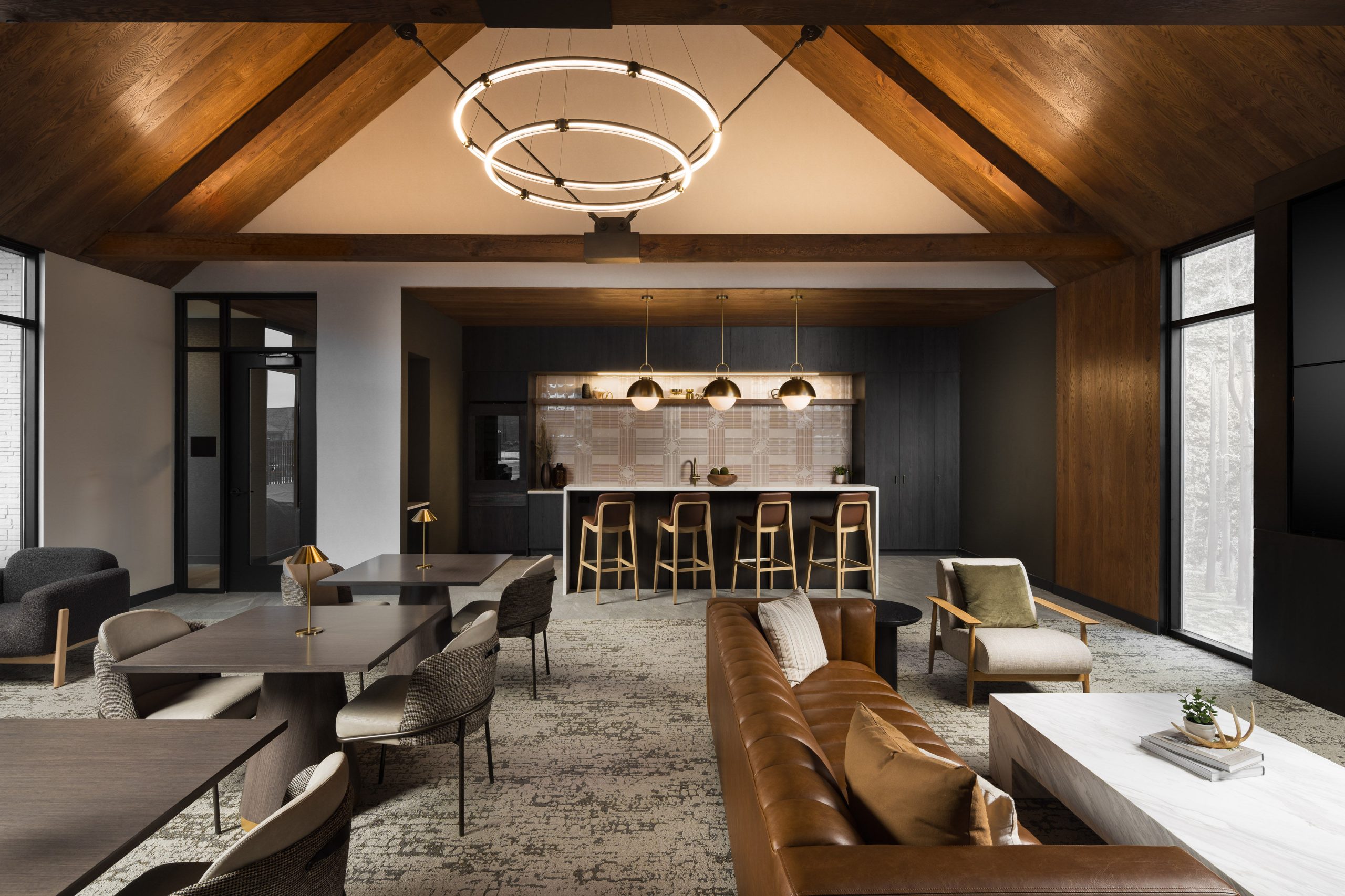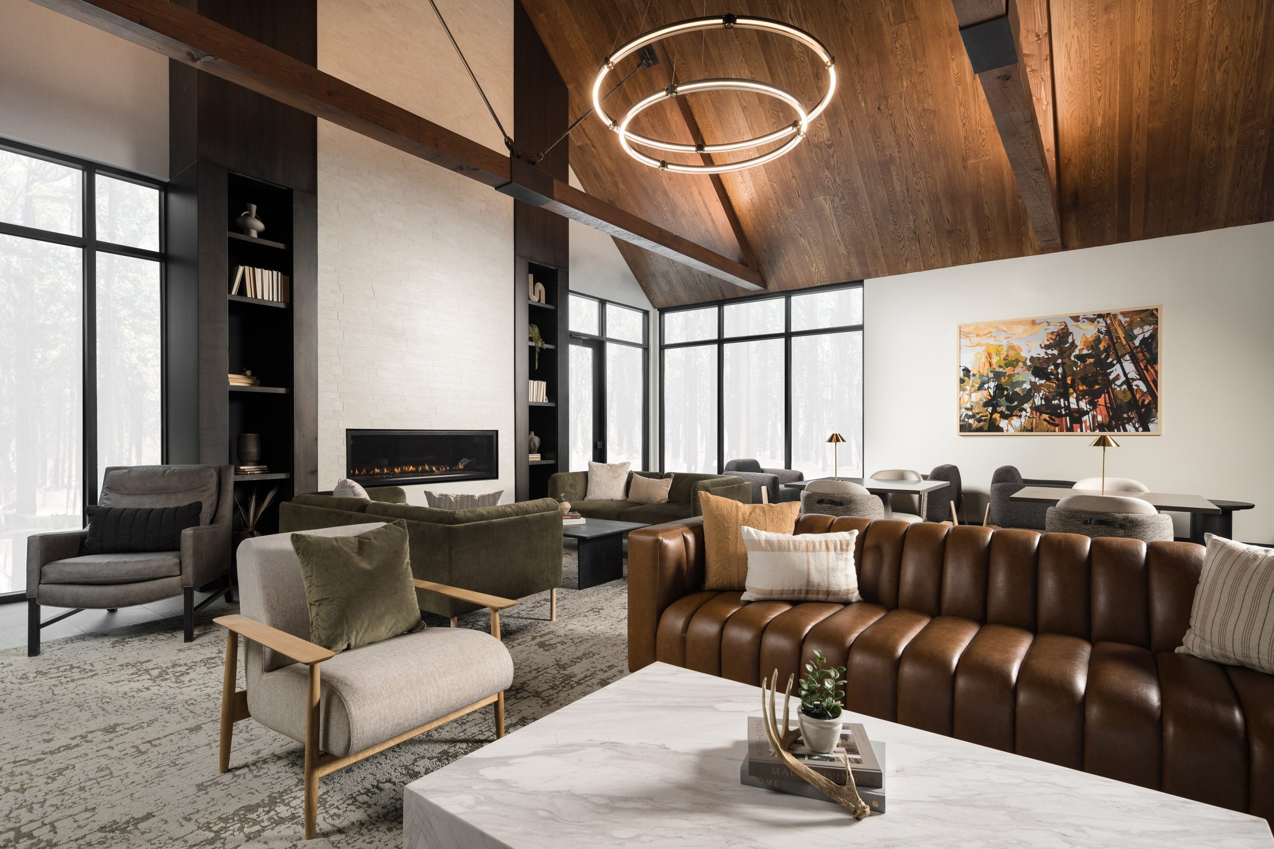 A newly built and stunning housing complex located in Oconomowoc, WI, Norden Range is built to support its nature-focused ethos. Featuring a variety of outdoor amenities, including a private walking path to the Lake Country Trail, the complex stays true to its, clean Scandinavian design, allowing biophilic elements to take centerstage. Mandel Group partnered with Forward Space to design and furnish Norden Range’s resident clubhouse, lobby, admin offices, and model units.