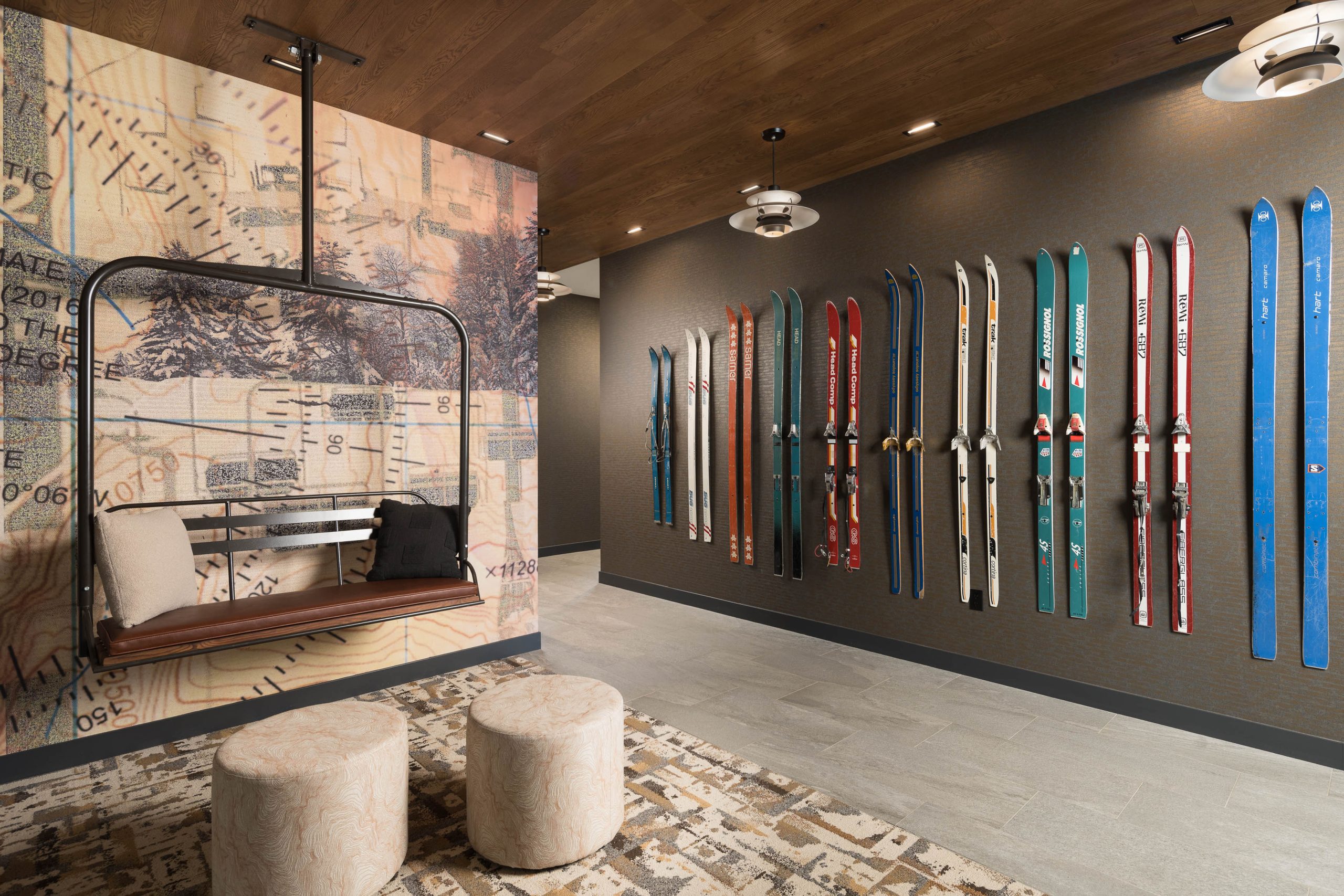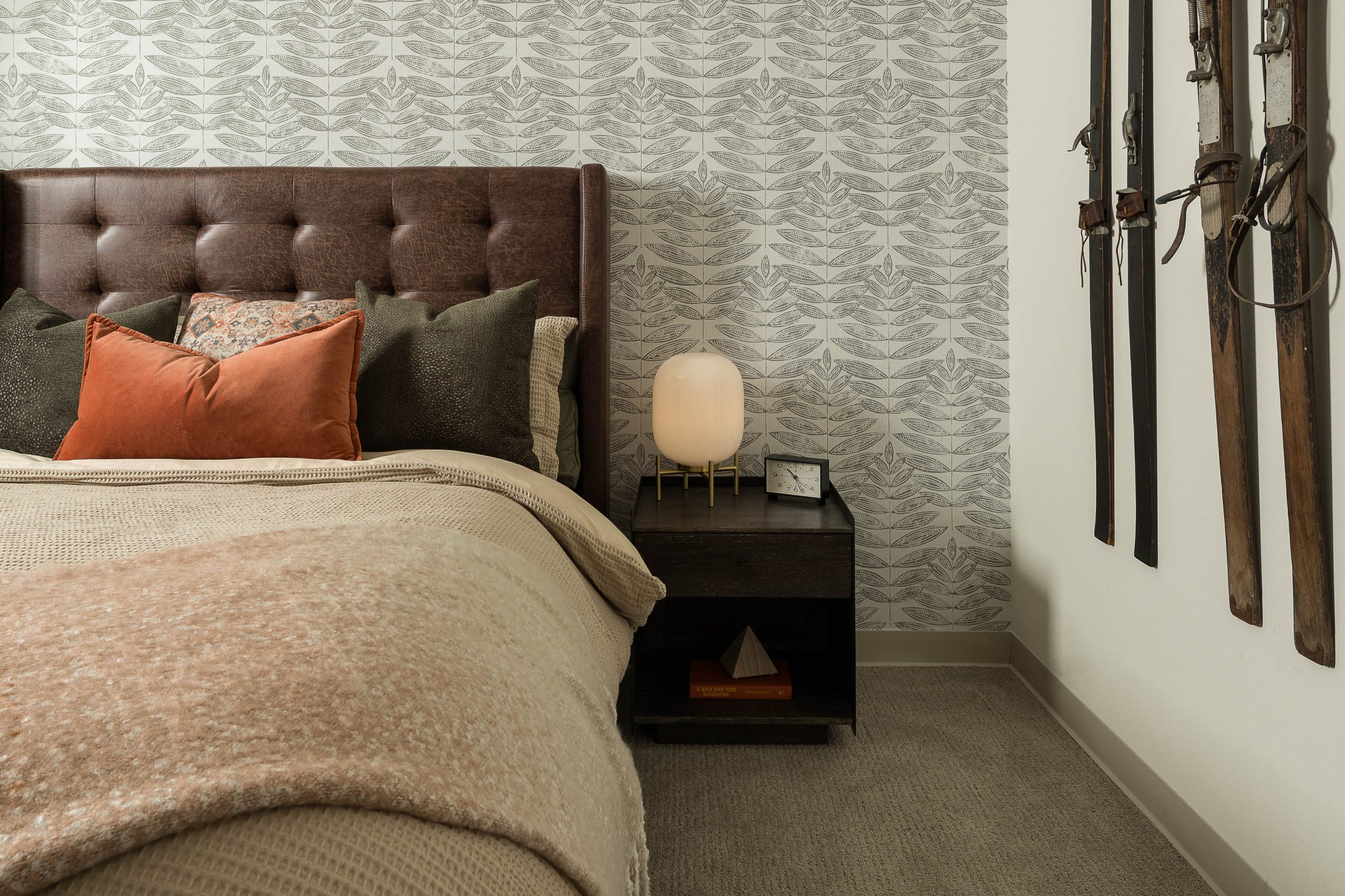 The location’s history as a ski lodge heavily influenced the furnishings of Norden Range’s model units. Vintage skis and snowshoes adorn the bedroom walls while plenty of plants tie in Norden Range’s biophilic ethos. Light woods, woven textures, and ceramics sculpted to resemble rippling water visually connect the location’s past as a natural getaway and current Scandinavian aesthetic.